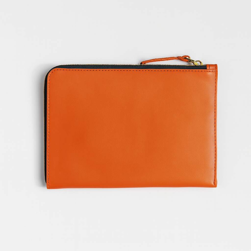 Елегантно голямо портмоне тип клъч, изработено от висококачествена естествена кожа в стилен оранжев цвят. Моделът разполага с удобен цип за сигурно затваряне и добре организиран вътрешен дизайн с отделения за карти, документи и банкноти. Подходящо както за ежедневна употреба, така и за специални поводи, портмонето комбинира практичност и изискан модерен стил.