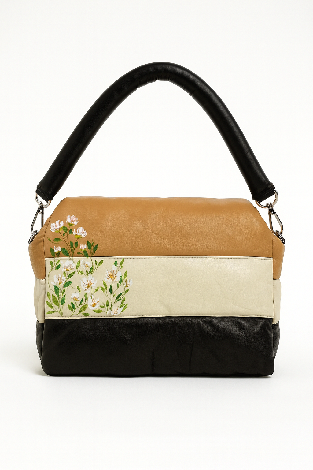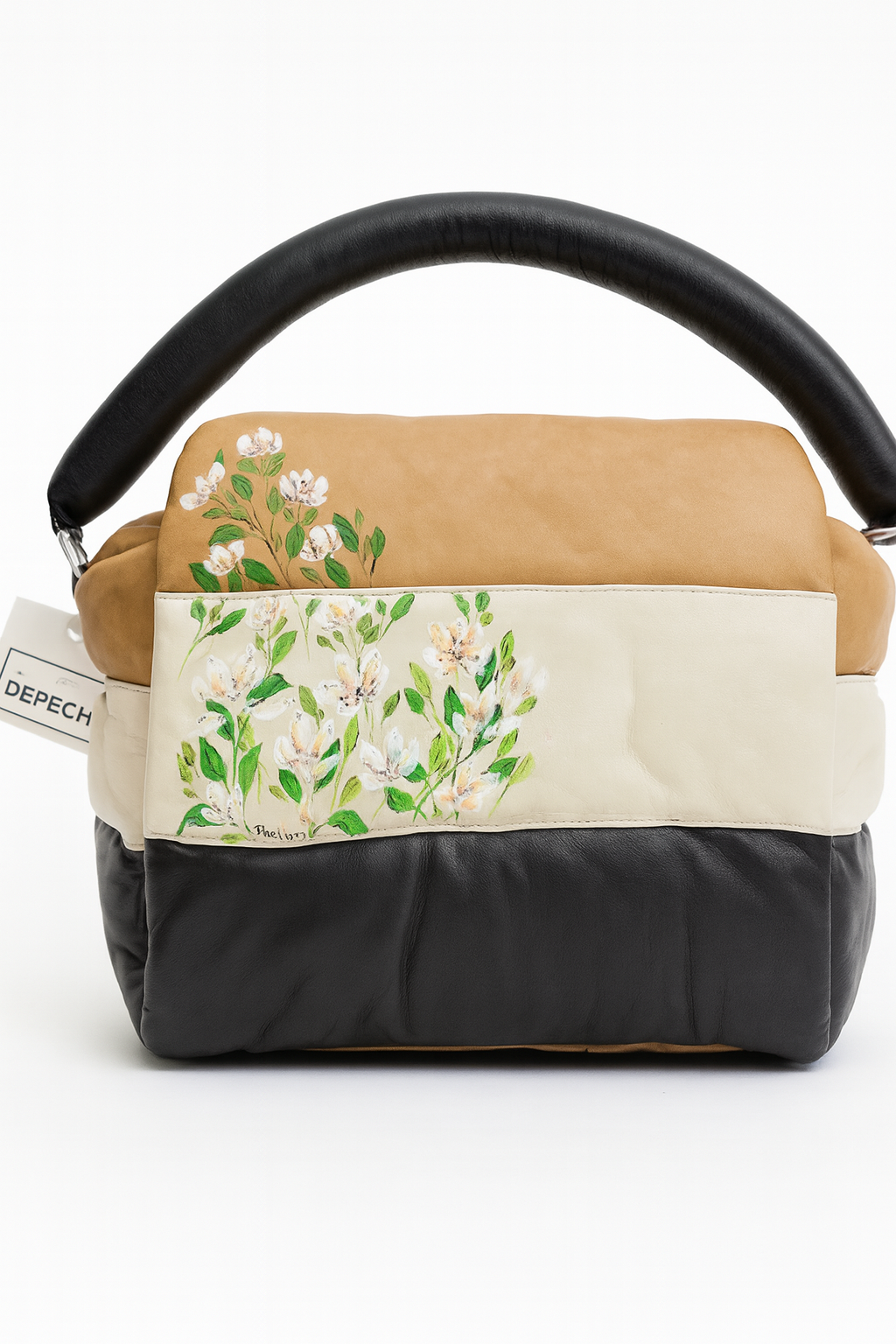Стилна и удобна дамска чанта Depeche, изработена от висококачествена естествена телешка кожа. Моделът впечатлява с елегантен тройноцветен дизайн и ръчно рисувани флорални акценти, които придават индивидуалност и чар. Чантата разполага с практична дълга дръжка за удобно носене през рамо или в ръка. Подходяща е както за ежедневието, така и за по-специални поводи.