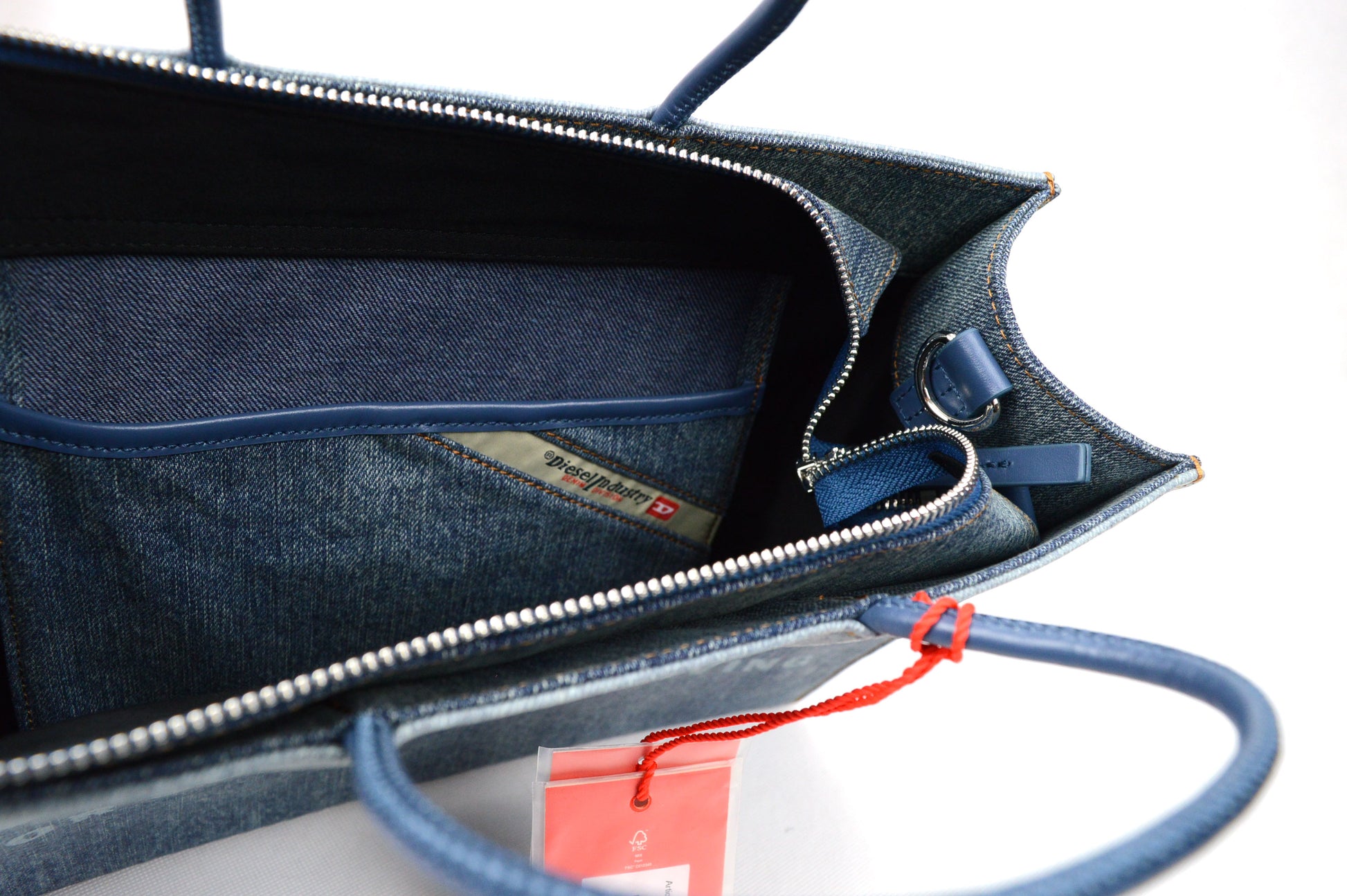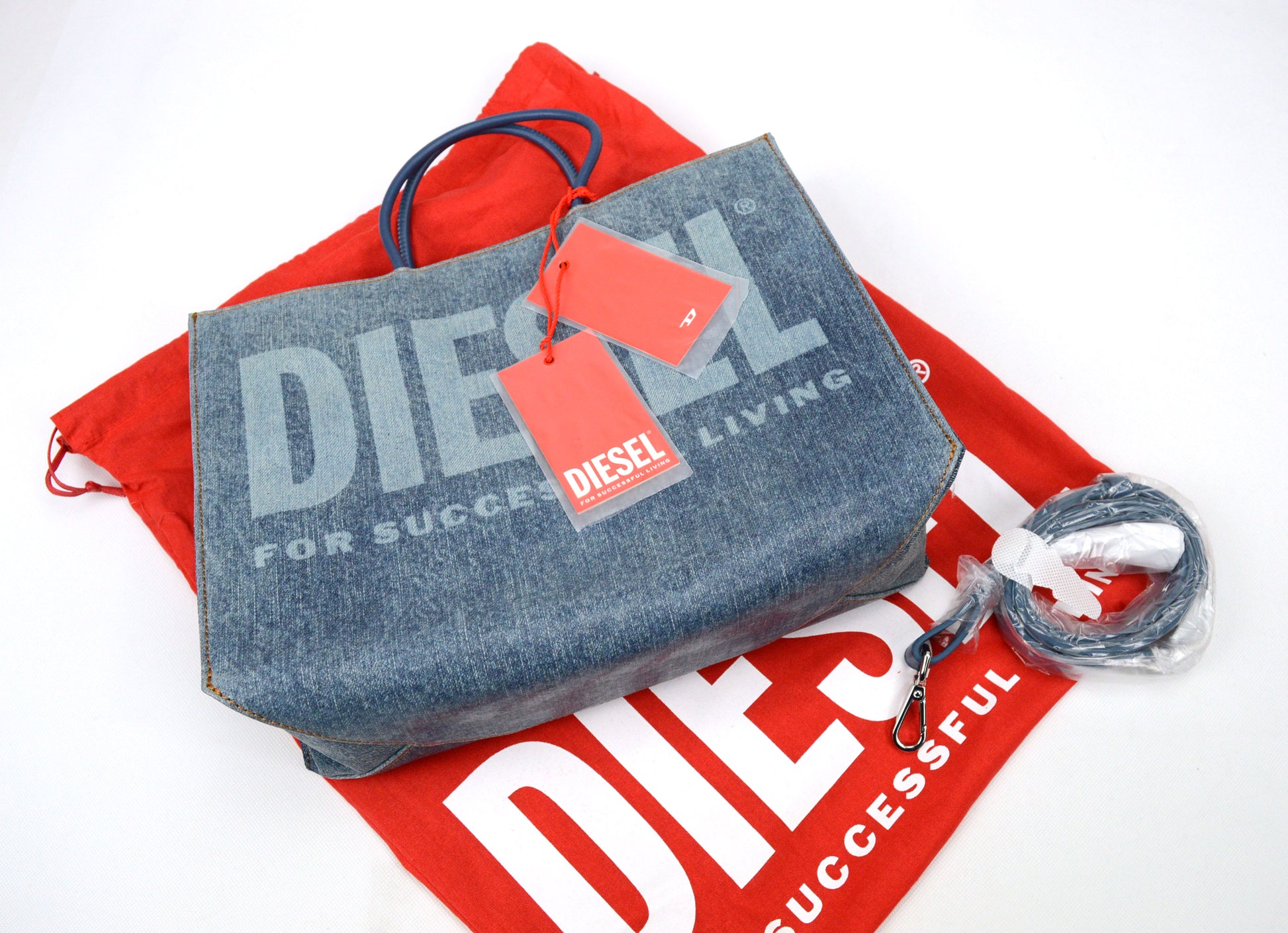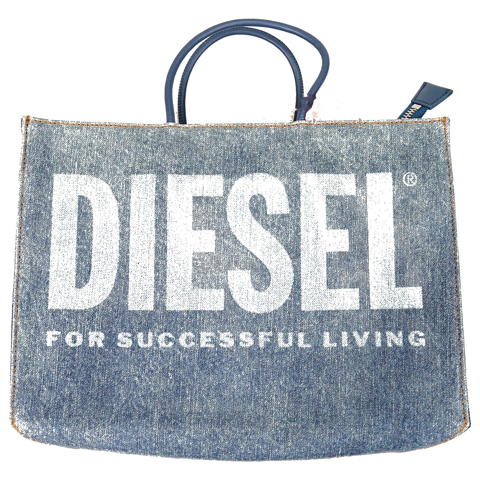 Иконична деним чанта тип tote от DIESEL с подчертана квадратна форма и голям принт “DIESEL – FOR SUCCESSFUL LIVING” отпред. Универсален ежедневен модел с две дръжки и контрастни шевове, който лесно се комбинира с casual и street визии.