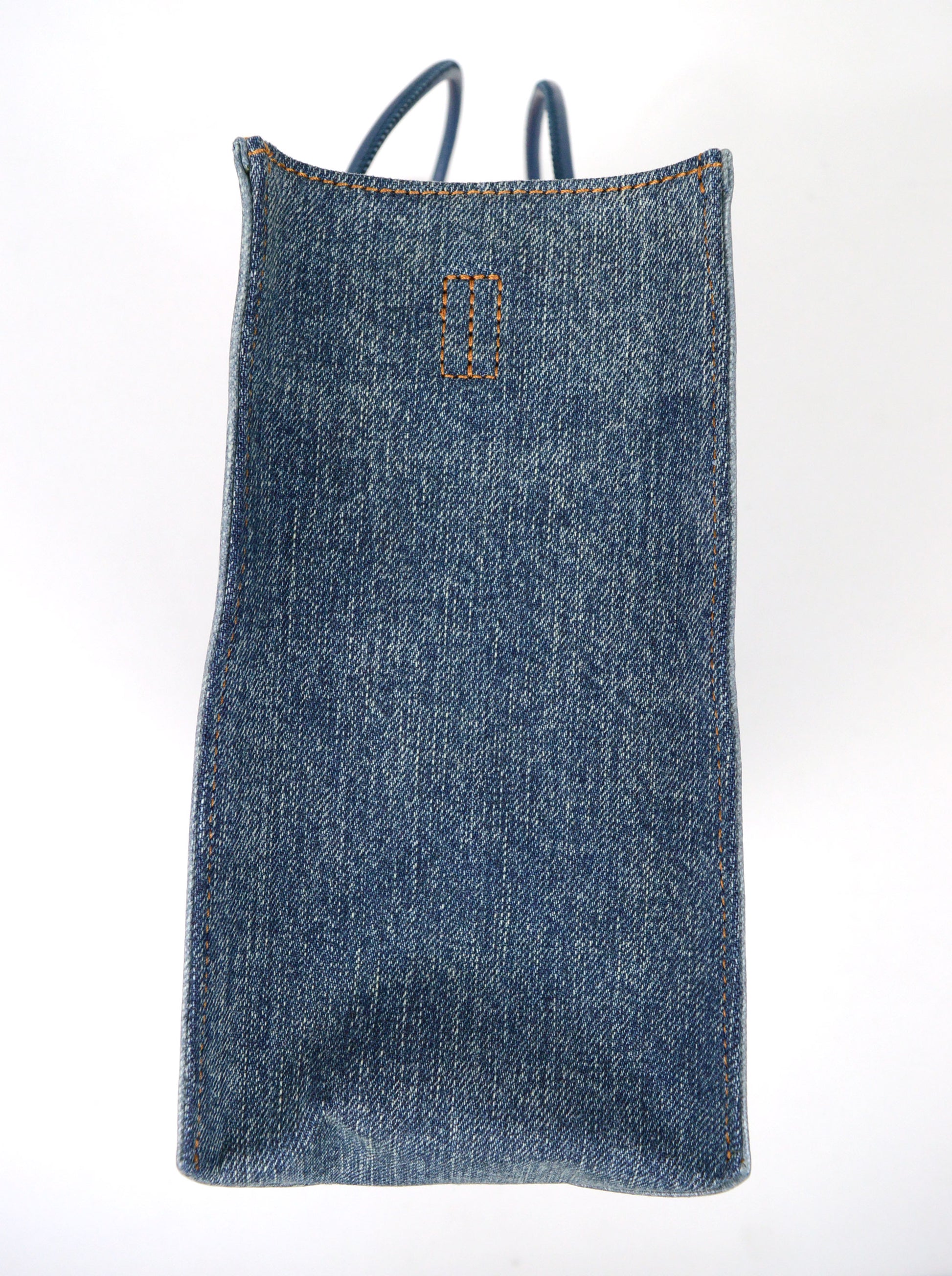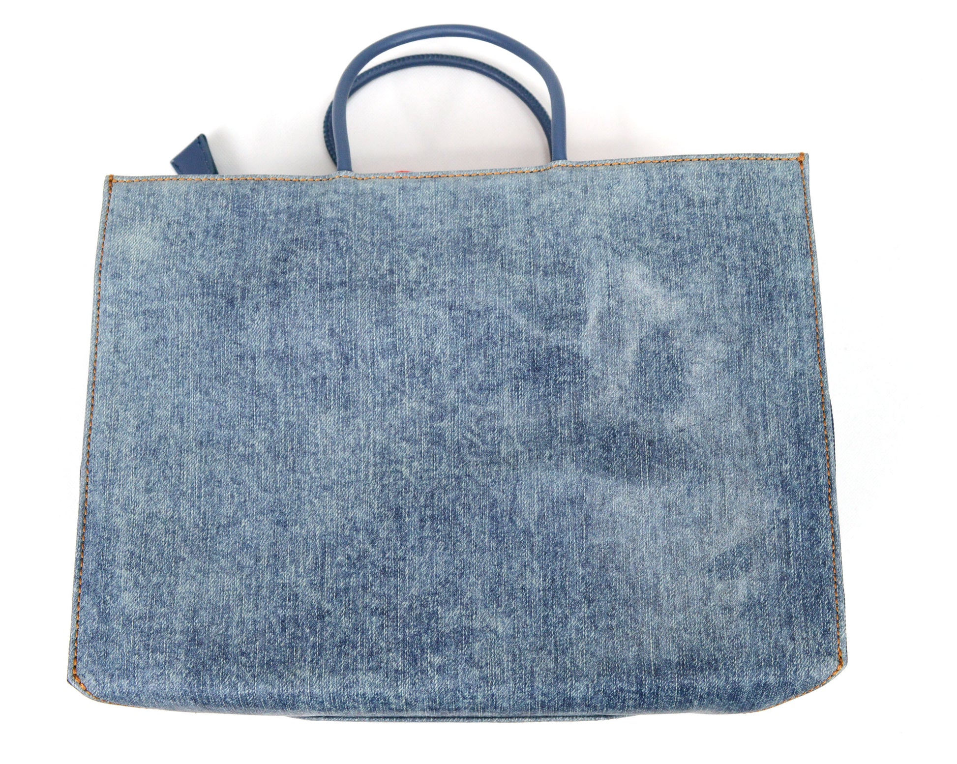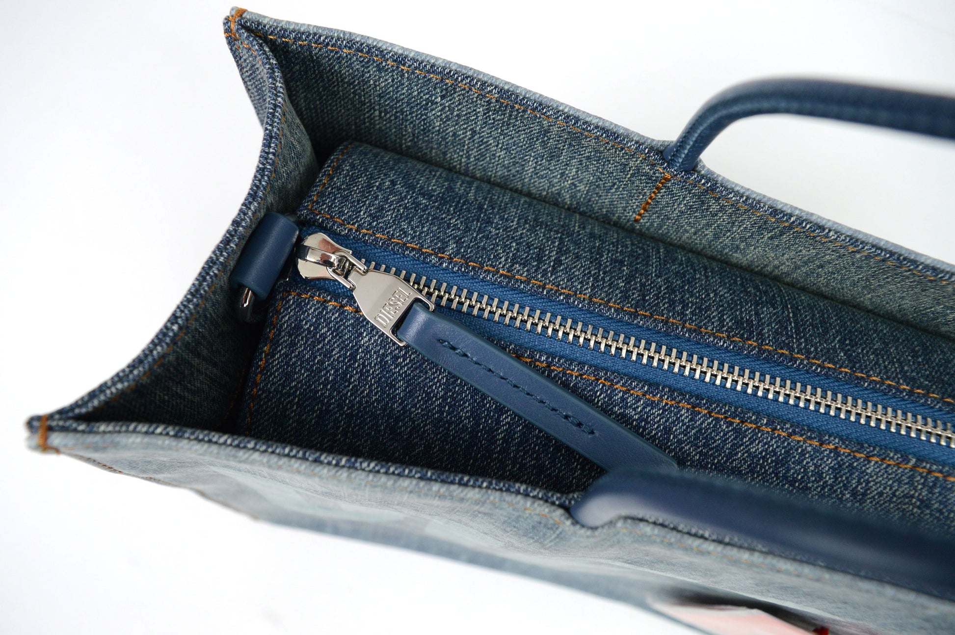 Иконична деним чанта тип tote от DIESEL с подчертана квадратна форма и голям принт “DIESEL – FOR SUCCESSFUL LIVING” отпред. Универсален ежедневен модел с две дръжки и контрастни шевове, който лесно се комбинира с casual и street визии.