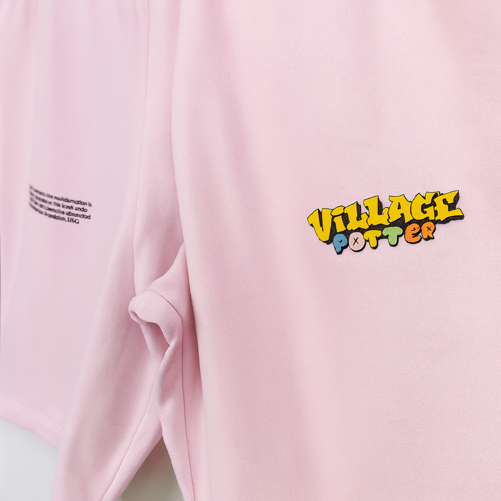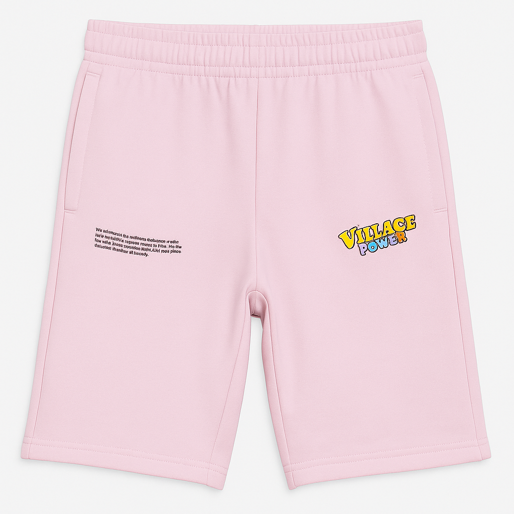 Къси панталони от мек памук в светло розово с еластичен колан. Декорирани с черен надпис и цветен принт, подходящи за ежедневие и свободно време.