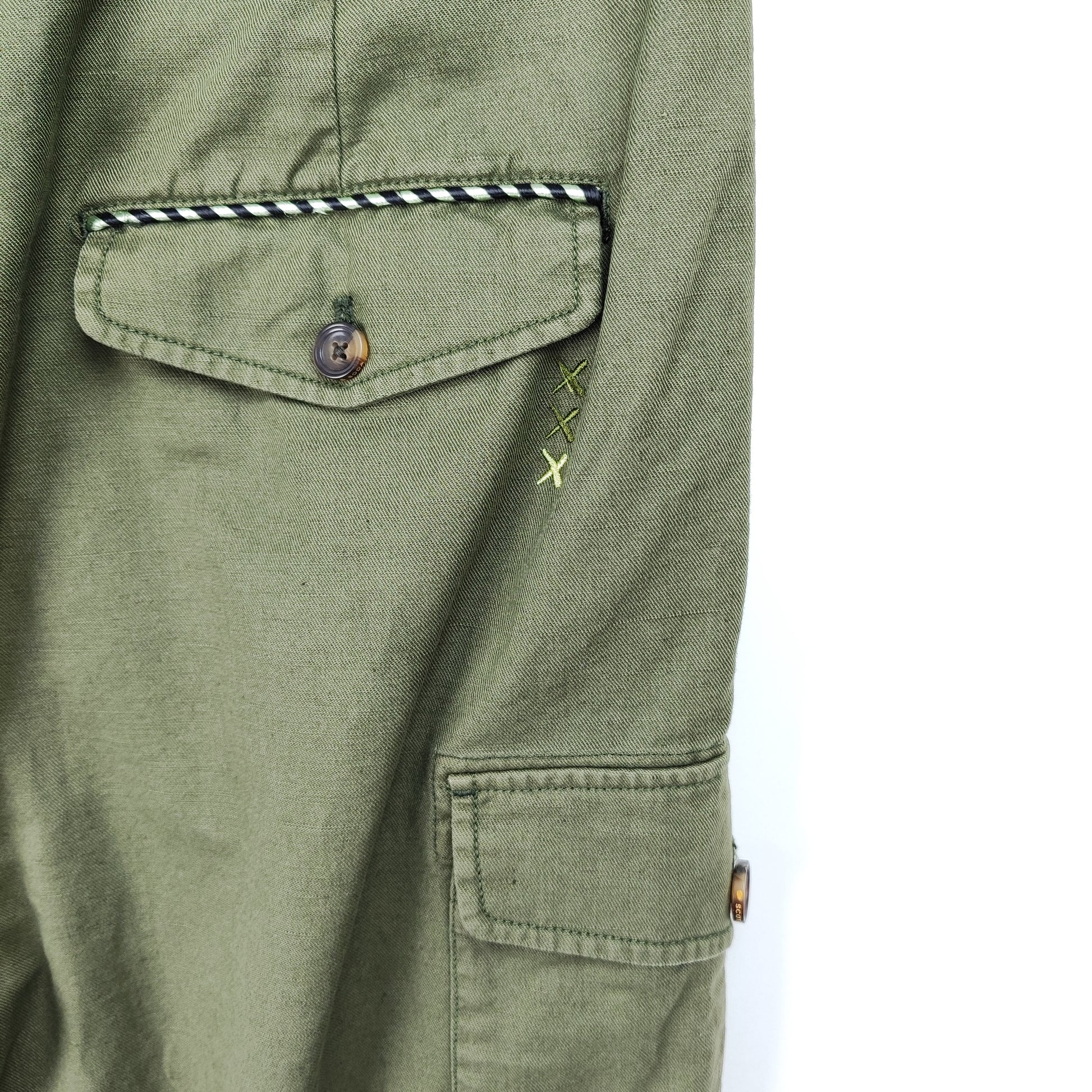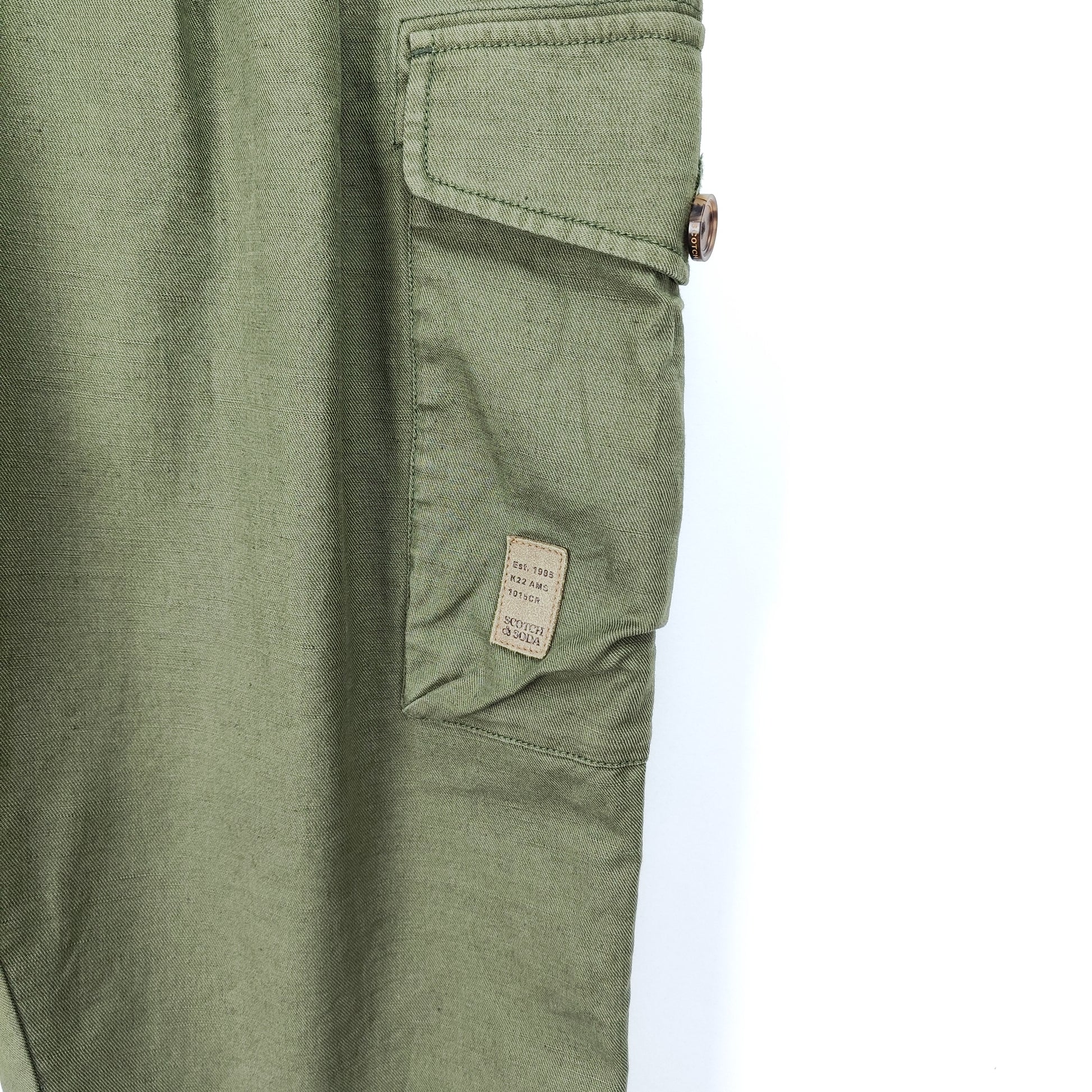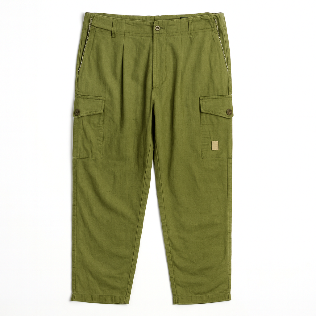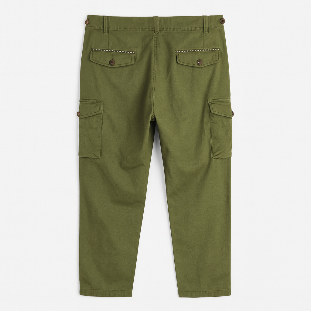 Мъжки карго панталон в маслинено зелено, изработен от 100% памук. Моделът е с relaxed fit кройка за комфорт и свобода на движение. Разполага с класически странични джобове, големи карго джобове с капаци и копчета, както и задни джобове. Коланът е подсилен с гайки за колан и тъмно копче, а декоративен кант в черно-бяло подчертава детайла по джобовете. Панталонът е подходящ за ежедневна употреба и комбинация с различни стилове.