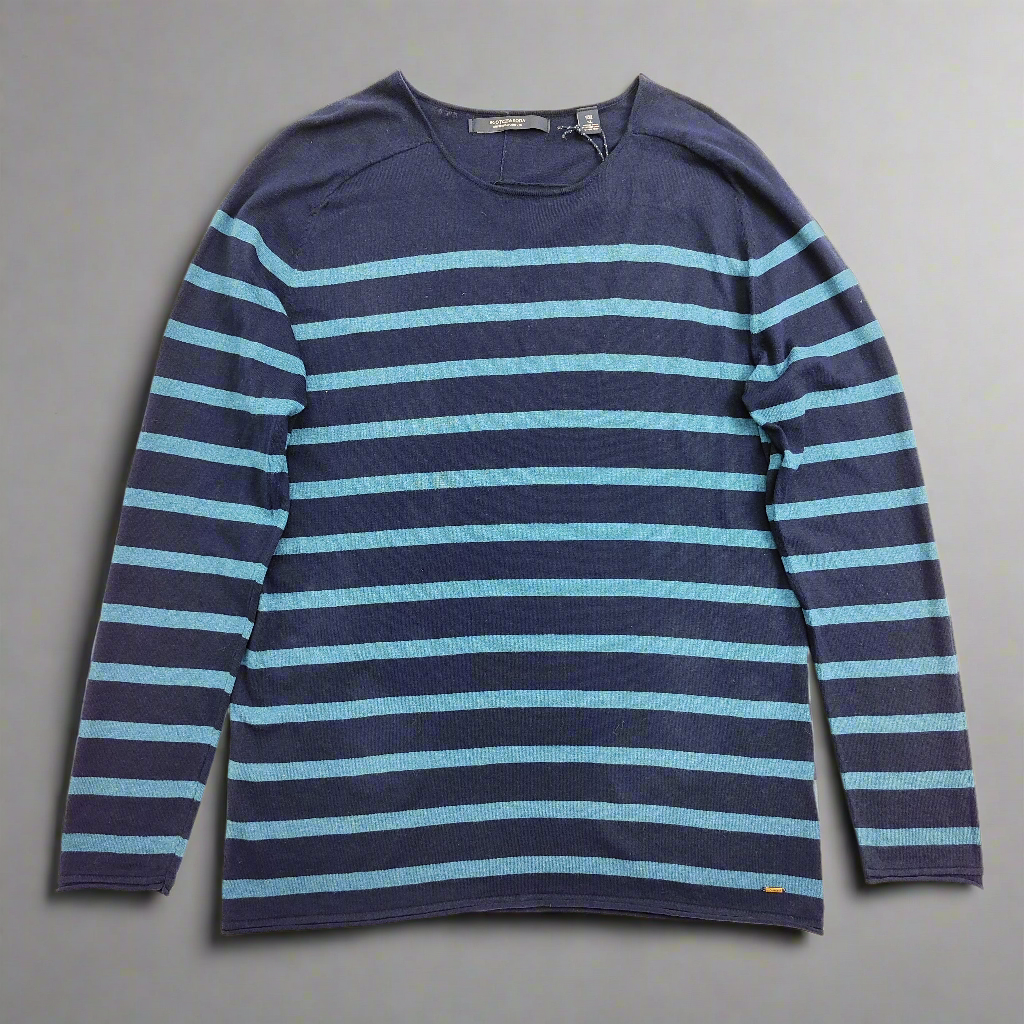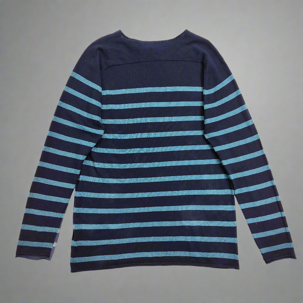Тънък пуловер с райета от кашмир и памук: Класика, преосмислена. Този пуловер съчетава вечната елегантност на райетата с мекотата на кашмира и здравината на памука. Фината плетка и контрастните цветове - тъмно синьо и небесно синьо - създават изискан и модерен вид. Пуловерът е с обло деколте и дълги ръкави, а релефната плетка добавя текстура и интерес. Подходящ за пролетните и есенните дни, този пуловер ще се превърне във ваш любим спътник.