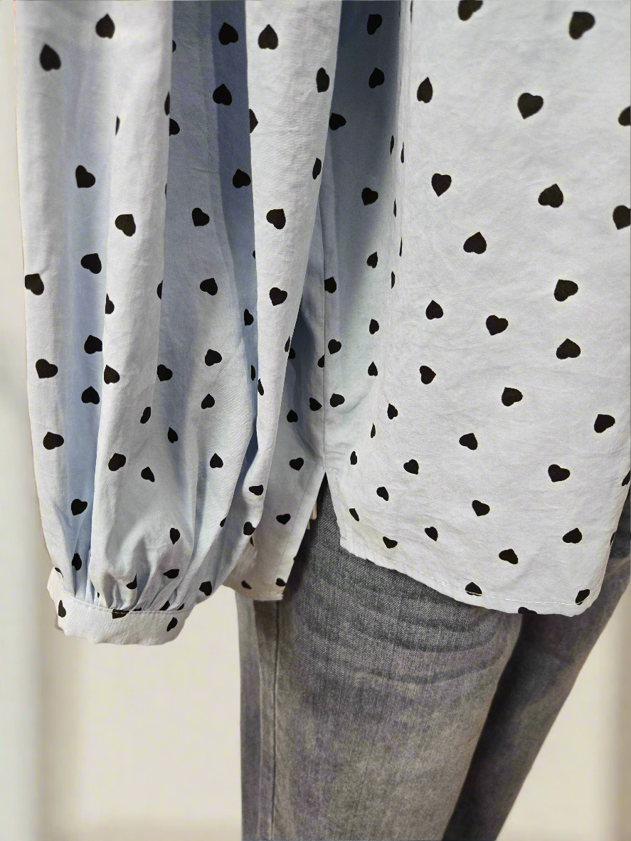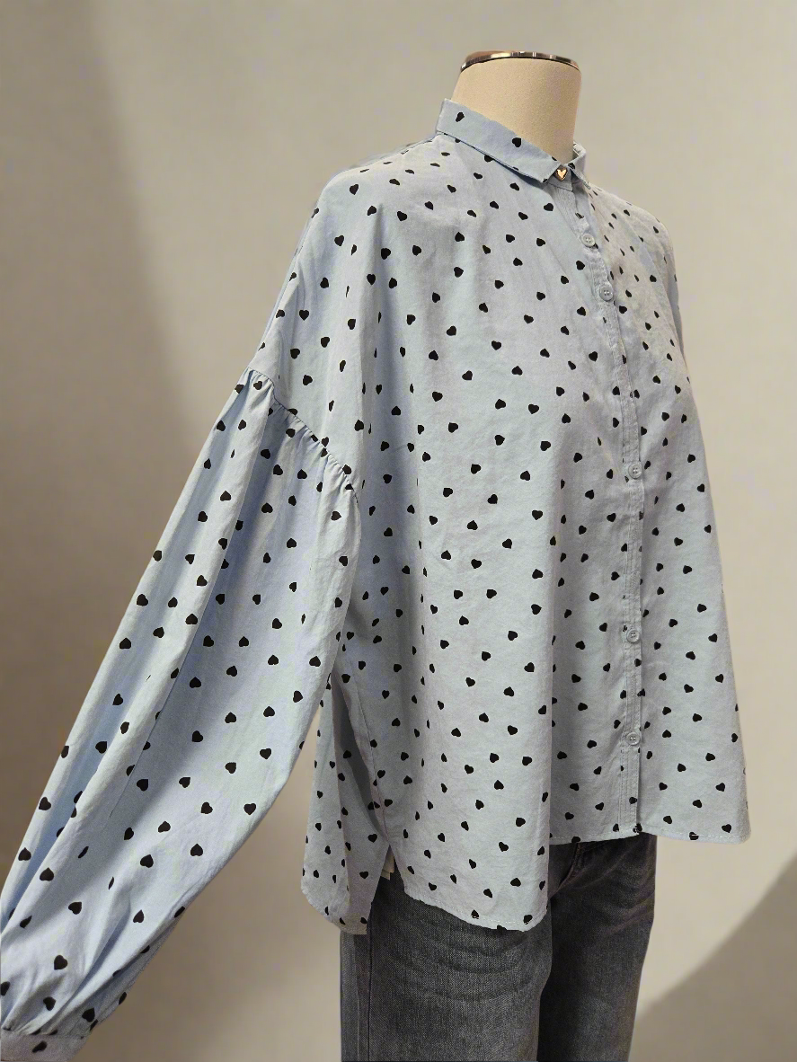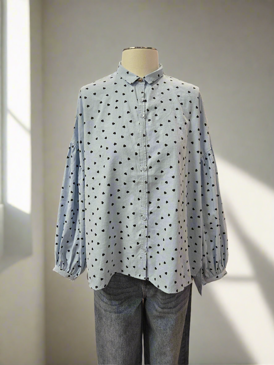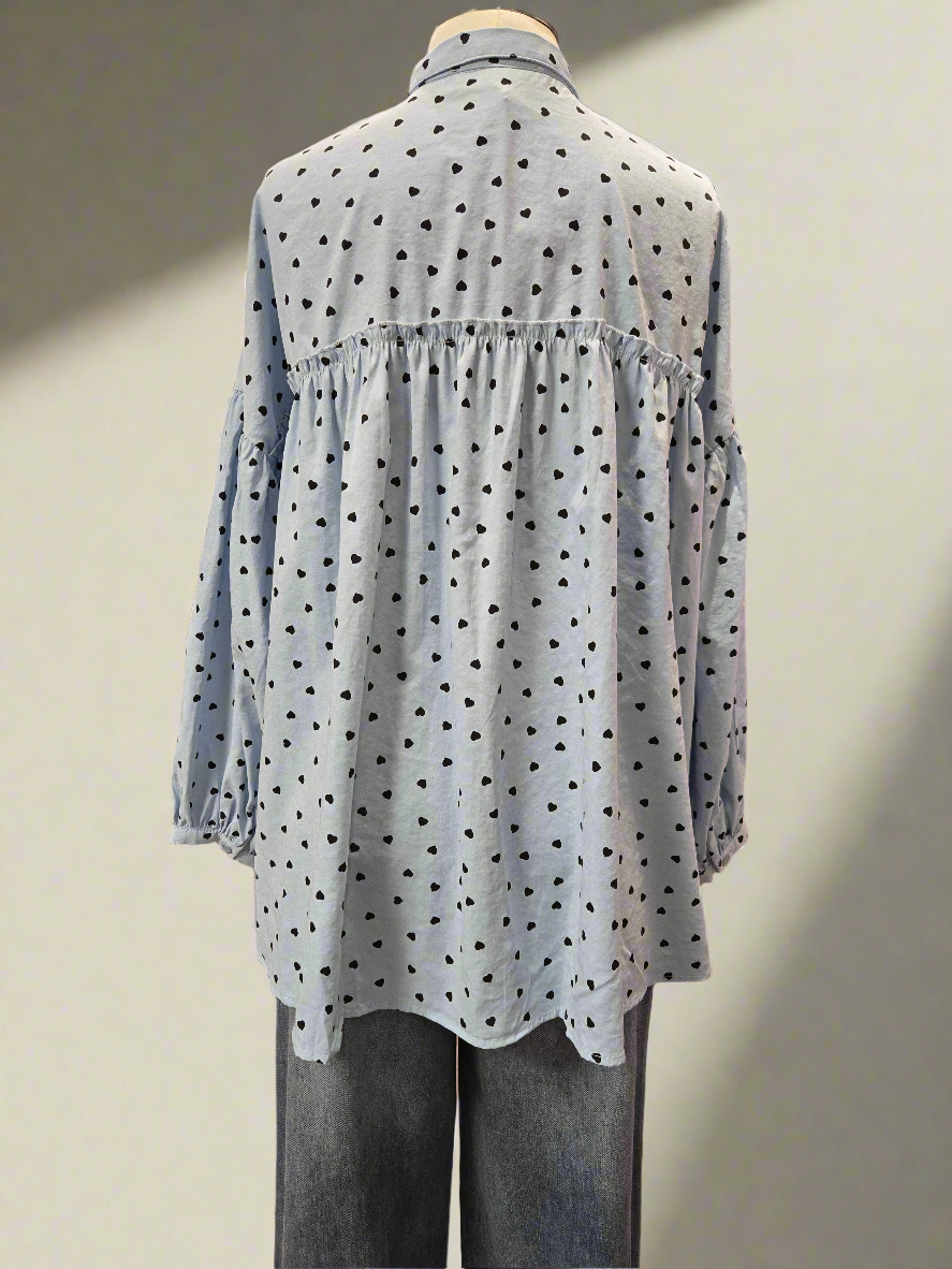 Нежно синята Oversize риза на сърчица е модерна и удобна дреха, която може да бъде както елегантна, така и ежедневна. Ето някои от нейните характеристики: