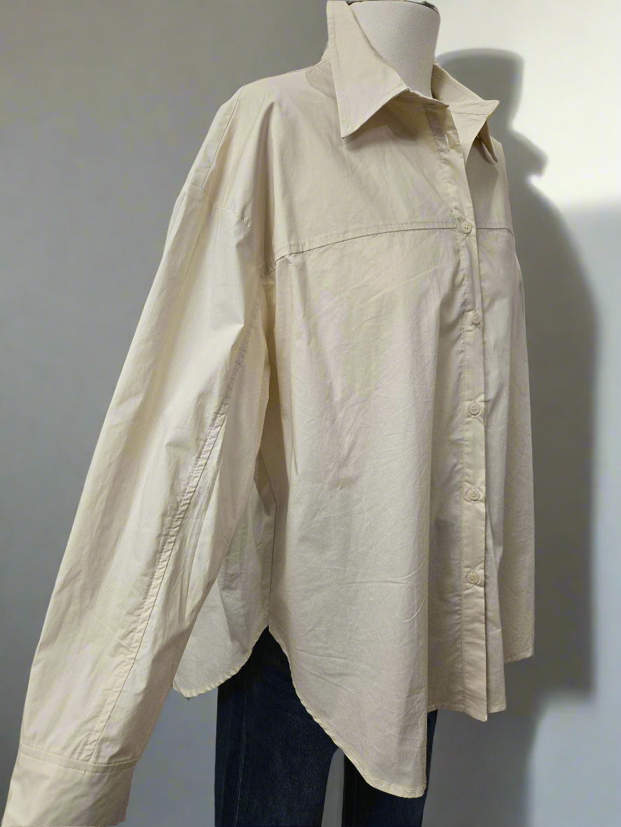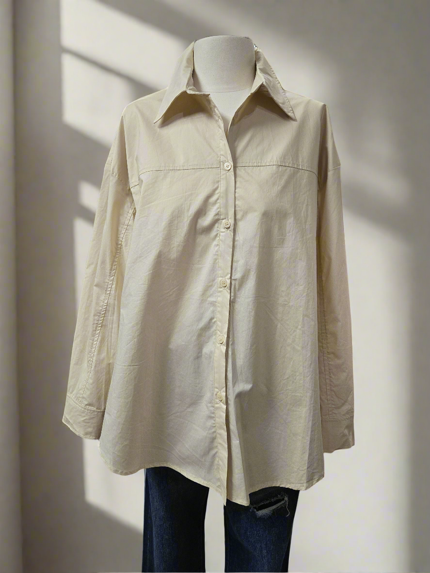 Дамска памучна риза Oversize в бежов цвят е удобна и стилна дреха, която може да се носи в различни ситуации. Ето някои от нейните характеристики: