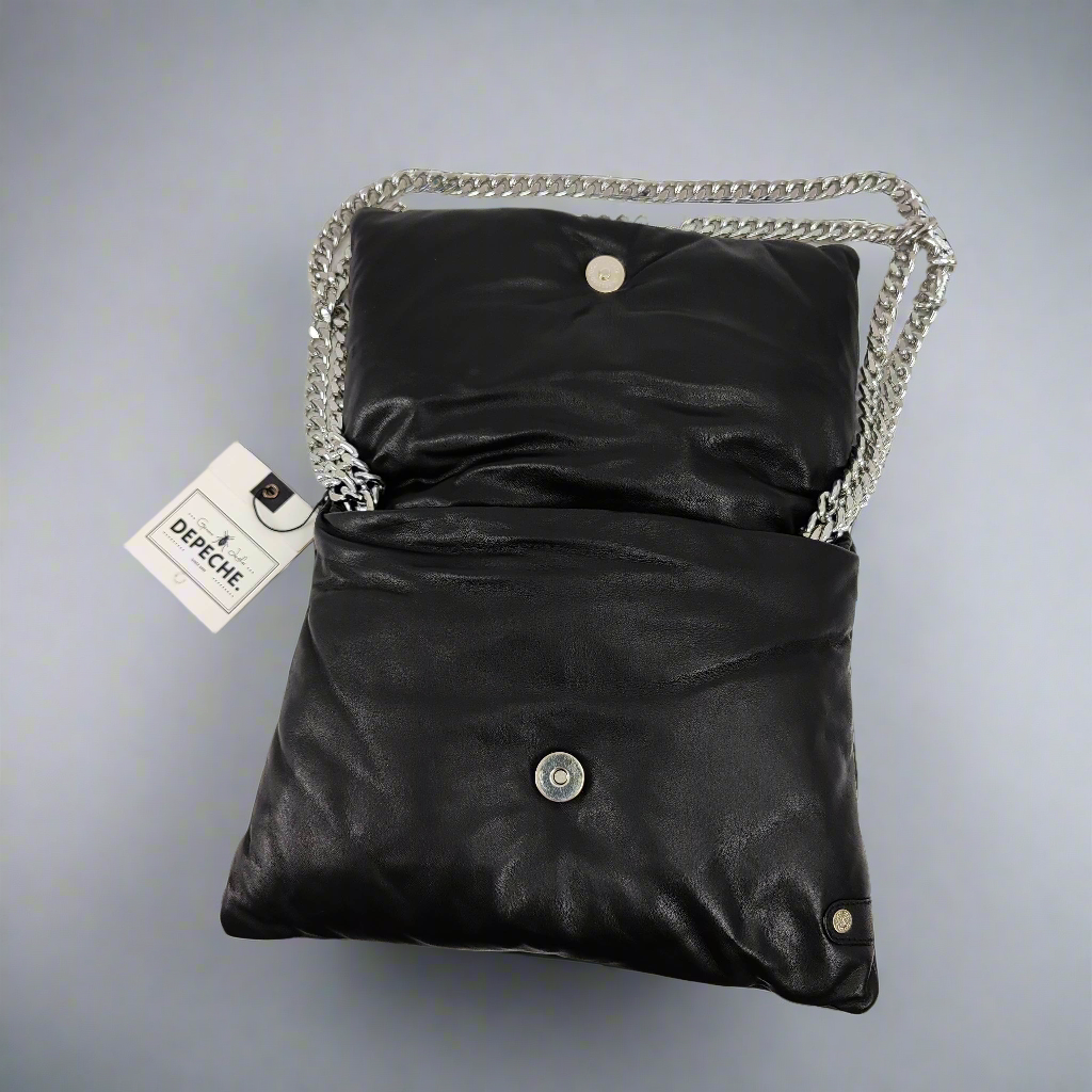 За дамите, които обичат да бъдат в центъра на вниманието, тази чанта е задължителна. Стилният контраст между меката черна кожа и лъскавия сребрист синджир създава запомнящ се визуален ефект. Независимо дали я комбинираш с дънки и тениска, или с елегантна рокля, тази чанта ще добави нотка на изтънченост към всяка визия.